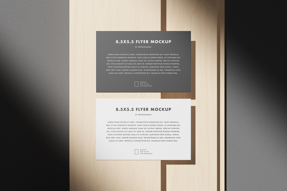 Present your flyer designs with confidence using this high-quality mockup. The 8.5x5.5 size is ideal for showcasing your creative work, providing ample space to display every intricate detail of your design. Whether you're designing for print or digital platforms, this mockup guarantees a visually captivating presentation that will captivate your audience and make your designs truly shine. The lifelike appearance of this mockup adds a touch of realism to your designs, allowing your clients and customers to envision the final product and make informed decisions.