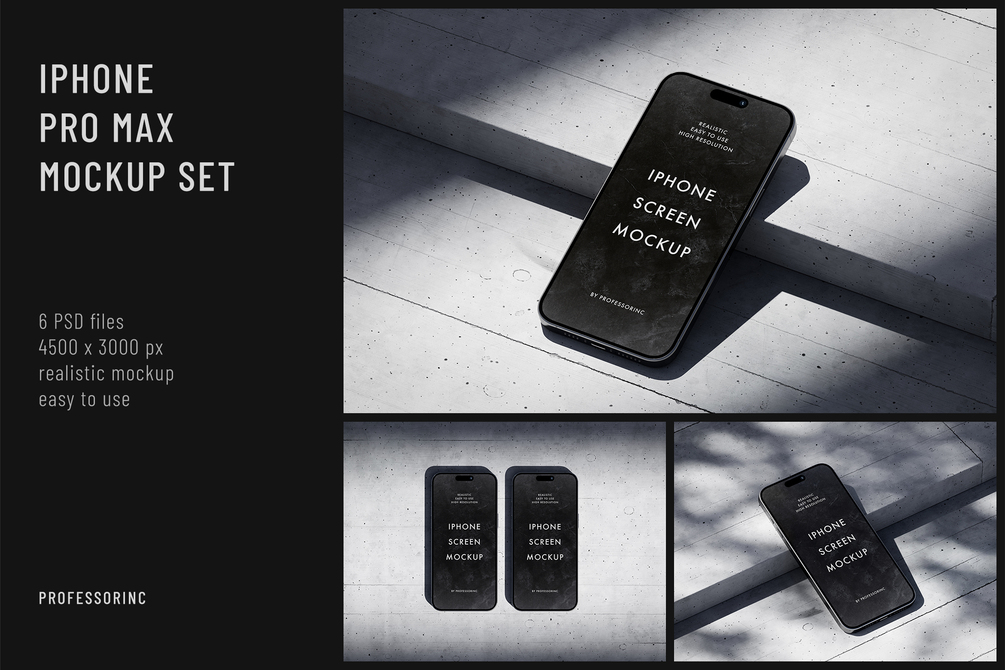 Unleash the full potential of your designs with our iPhone 15 Pro Max Mockup Set, a premium collection meticulously crafted to elevate your digital creations. This comprehensive package includes six high-quality PSD files, each designed to showcase your work with unparalleled realism and professional flair. With a stunning resolution of 4500x3000 px, these mockups ensure that every nuance of your design is displayed with exceptional clarity and precision.