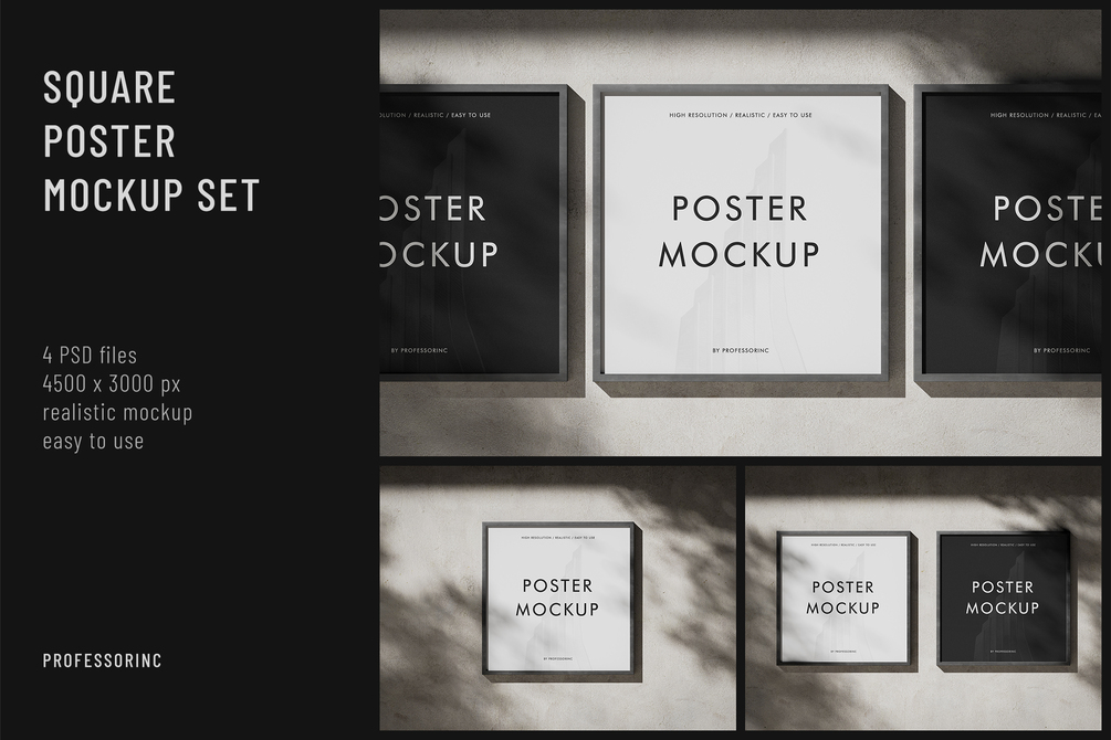 Elevate your workflow with four meticulously crafted PSD files, each designed for maximum efficiency and visual impact. Featuring an impressive 4500x3000 px resolution and a perfect 2500x2500 px square format, these professional square mockups guarantee crystal-clear presentation of your artwork, prints, or advertising materials.